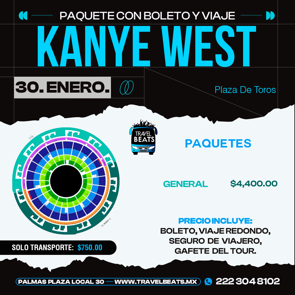 TRAVEL BEATS: Tu agencia de viajes a conciertos desde Puebla te lleva a disfrutar el concierto de KanYe West en La Plaza De Toros, no te pierdas de este gran evento. #EnjoyTheGigs!
